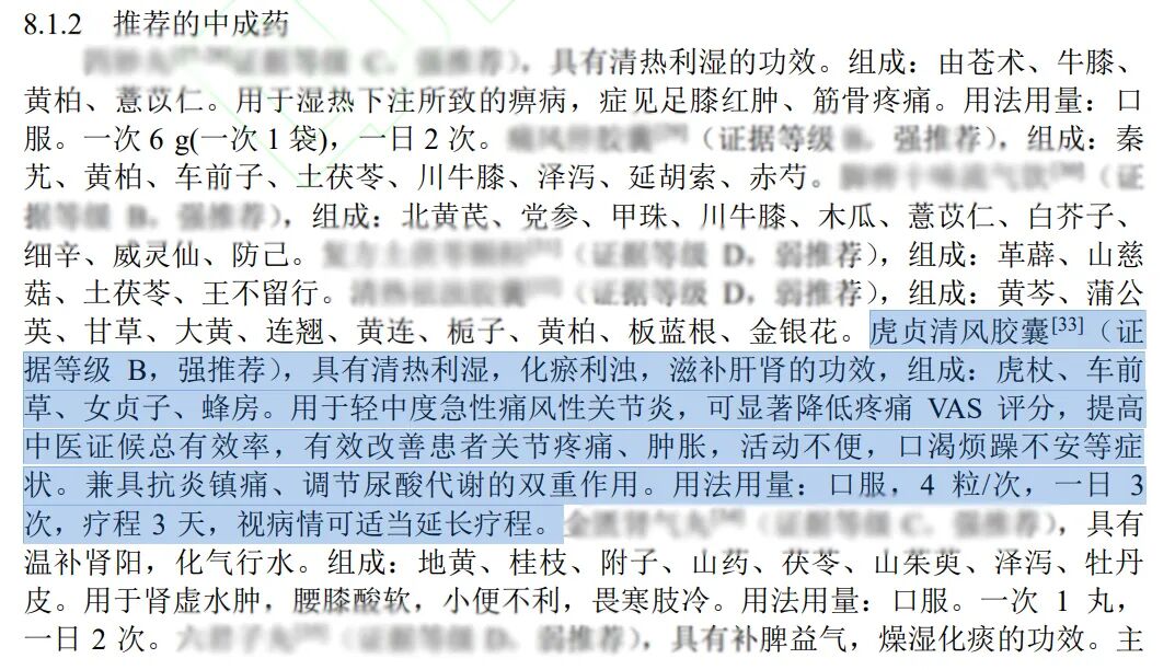 《指南》中明确指出,虎贞清风胶囊具有清热利湿,化瘀利浊,滋补肝肾的功效,用于轻中度急性痛风性关节炎,可显著降低疼痛 VAS 评分,提高中医证候总有效率,有效改善患者关节疼痛、肿胀,活动不便,口渴烦躁不安等症状。兼具抗炎镇痛、调节尿酸代谢的双重作用。
