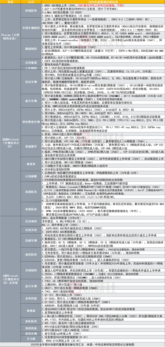 今年下半年还有哪些创新药领域值得关注?陈竹分析道:“我们判断ADC(抗体药物偶联物)、IO(免疫肿瘤治疗)迭代、GLP-1迭代、TCE(T细胞衔接器)、通用型细胞治疗、IBD(炎症性肠病)等领域是潜力重磅炸弹方向,国内公司均有布局,目前进度处于临床I/Ⅱ/Ⅲ期为主。我们预计商业化井喷阶段即将到来,2025年下半年多个创新药龙头公司催化剂密集,其进展值得期待。(详见下表)”