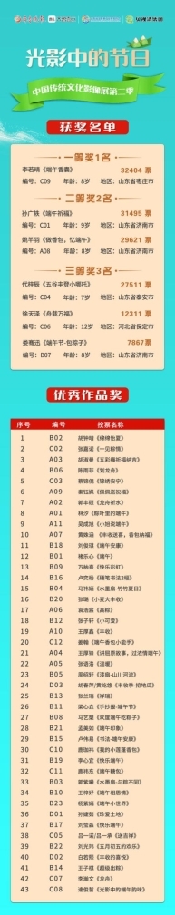 “端午季”作品通过网络投票和活动积分核算,总投票数达到167,523张。经过专家综合评选,共评出一等奖1名,二等奖2名,三等奖3名,优秀奖43名,获奖名单如下: