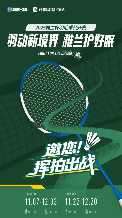 正值全民健身热潮持续升温之际,由雅兰发起的“羽动新境界 雅兰护好眠”2025雅兰杯羽毛球公开赛已进入关键赛程阶段。自11月22日在深圳启动首场比赛以来,赛事凭借高参与度与健康主题,迅速引发关注。作为深耕睡眠领域半世纪的品牌,雅兰此次以羽毛球赛事为纽带,不仅为运动爱好者搭建了竞技交流平台,更将“享运动·好睡眠”的生活主张传递给大众,推动“运动—恢复—睡眠”的健康闭环融入日常生活。