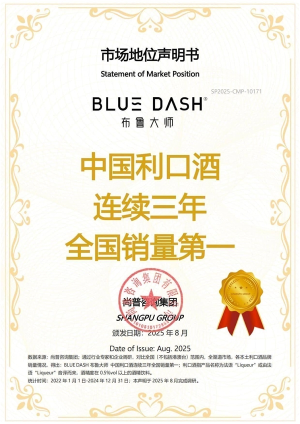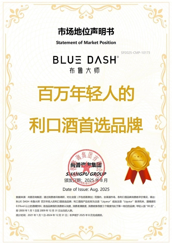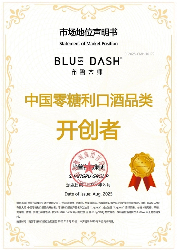 2025年8月,尚普咨询集团向上海落蓝科技有限公司旗下品牌BLUE DASH布鲁大师颁发【中国零糖利口酒品类开创者】、【百万年轻人的利口酒首选品牌】、【中国利口酒连续三年全国销量第一】三项市场地位声明书。这不仅是对一个品牌商业成就的地位声明,更是对一场饮酒态度革新运动的加冕——在依旧惯性的酒类市场,仍有品牌敢于颠覆框架,用纯粹、轻松、易饮的蓝色浪潮,引领百万年轻人选择“更快进入状态、更爽表达自我”的生活方式。