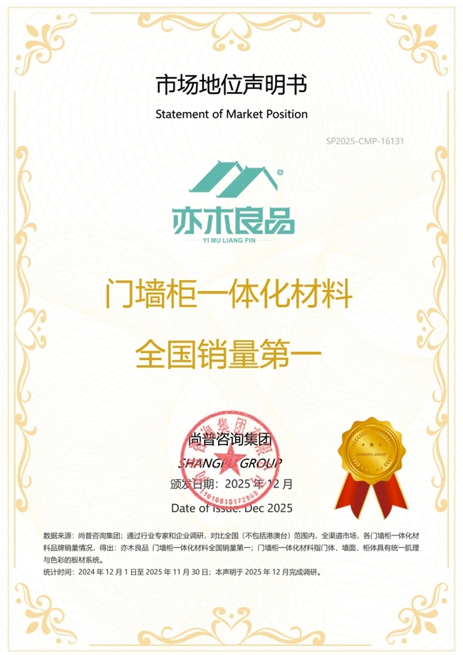 捷报再传!2025年12月,国内权威咨询机构尚普咨询集团,正式向亦木良品颁发市场地位声明书,授予品牌「门墙柜一体化材料全国销量第一」的重磅声明!
