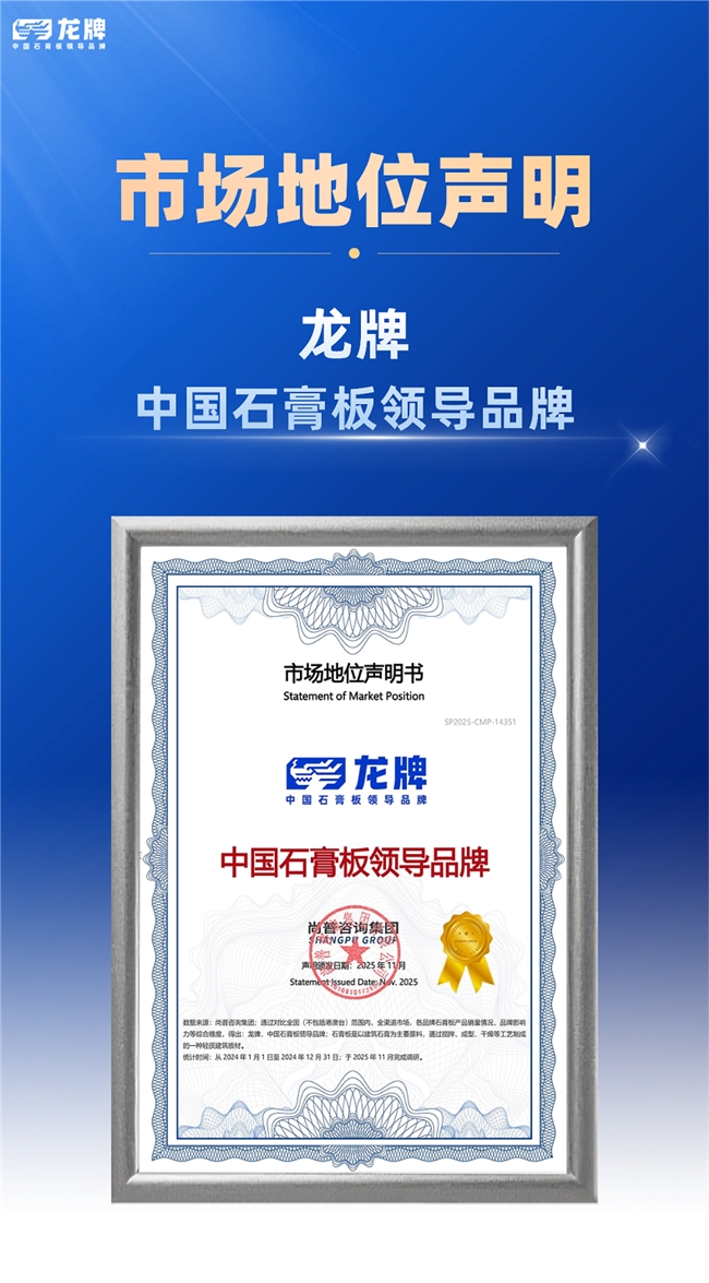 2025年11月,尚普咨询集团有限公司向北新建材集团旗下品牌“龙牌”颁发【龙牌 中国石膏板领导品牌】市场地位证书。该认证基于全国(不含港澳台)全渠道市场中各品牌石膏板产品的销量情况及品牌影响力等多维度综合对比得出,不仅是对龙牌品牌影响力与产品实力的高度认可,更证明了龙牌在中国石膏板行业的领导地位。