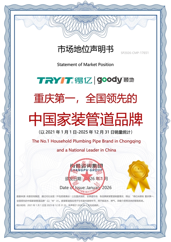 2026年1月,尚普咨询集团向得亿&顾地颁发市场地位声明书。此次得亿&顾地荣获尚普咨询【重庆第一,全国领先的中国家装管道品牌(以2021年1月1日-2025年12月31日销量统计)】市场地位声明,这一成绩不仅彰显了得亿&顾地在行业内的卓越地位,也为中国家装管道市场的发展注入了强大动力。