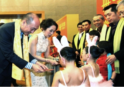 2011年,黄一宗与妻子一起出席农历新年活动,两名装扮成兔子的小女孩向他们拜年。(档案照片)
