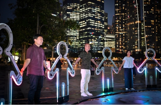 今年5月,国家发展部长徐芳达(左一)、黄一宗(中),以及市区重建局主席吴凤萍(左三)等嘉宾牵起剪影的手,唤醒光与乐章,为“照亮新加坡2025”揭幕。(大华银行提供)