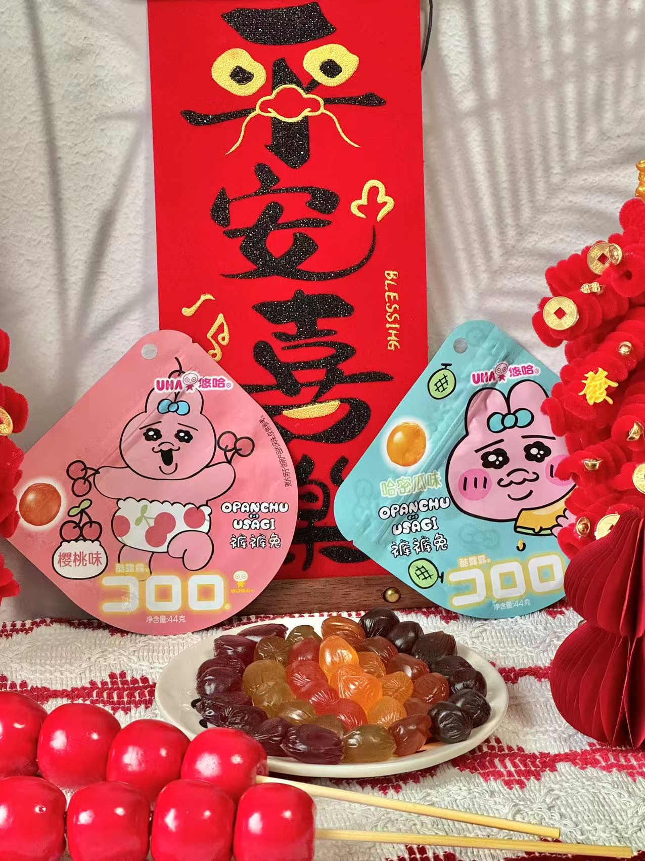 去年,悠哈酷露露携手人气IP“裤裤兔”,推出联名限定款樱桃与哈密瓜口味。清新果味搭配活泼包装,带来耳目一新的选择。哈密瓜味清爽香甜,回味悠长,仿佛一口咬下阳光下的鲜活;樱桃味馥郁香浓,口感软韧甜蜜,如红玛瑙般晶莹诱人。软糖坚持添加真实果汁,保持一贯的浓郁果香,外层包裹胶原蛋白肠衣,带来Q弹脆爽的丰富口感。