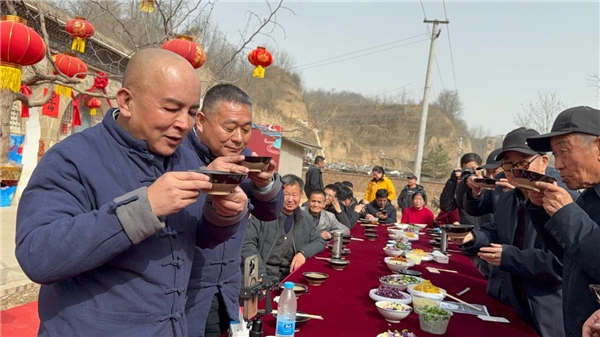 数百人同食一锅羊肉饸饹,热气蒸腾中,牧羊人埋头吃面的满足、相邻碰碗的豪爽、孩童被辣到的表情、老人闭眼回味的瞬间,被镜头一一捕捉。地椒羊肉的独特香味弥漫整个院落,众人赞不绝口:“这辈子没吃过这么香的饸饹!”“安塞的羊肉,就是不一样!”